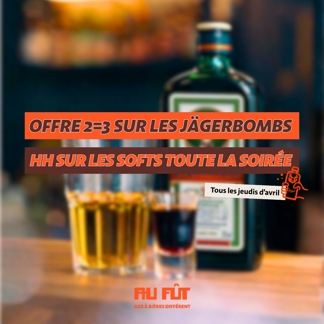 Tous les jeudis du mois d’avril, Au Fût Claye-Souilly te propose une offre 2=3 (2 achetés 1 offert) sur les Jägerbombs et Happy Hour sur les softs toute la soirée 🔥