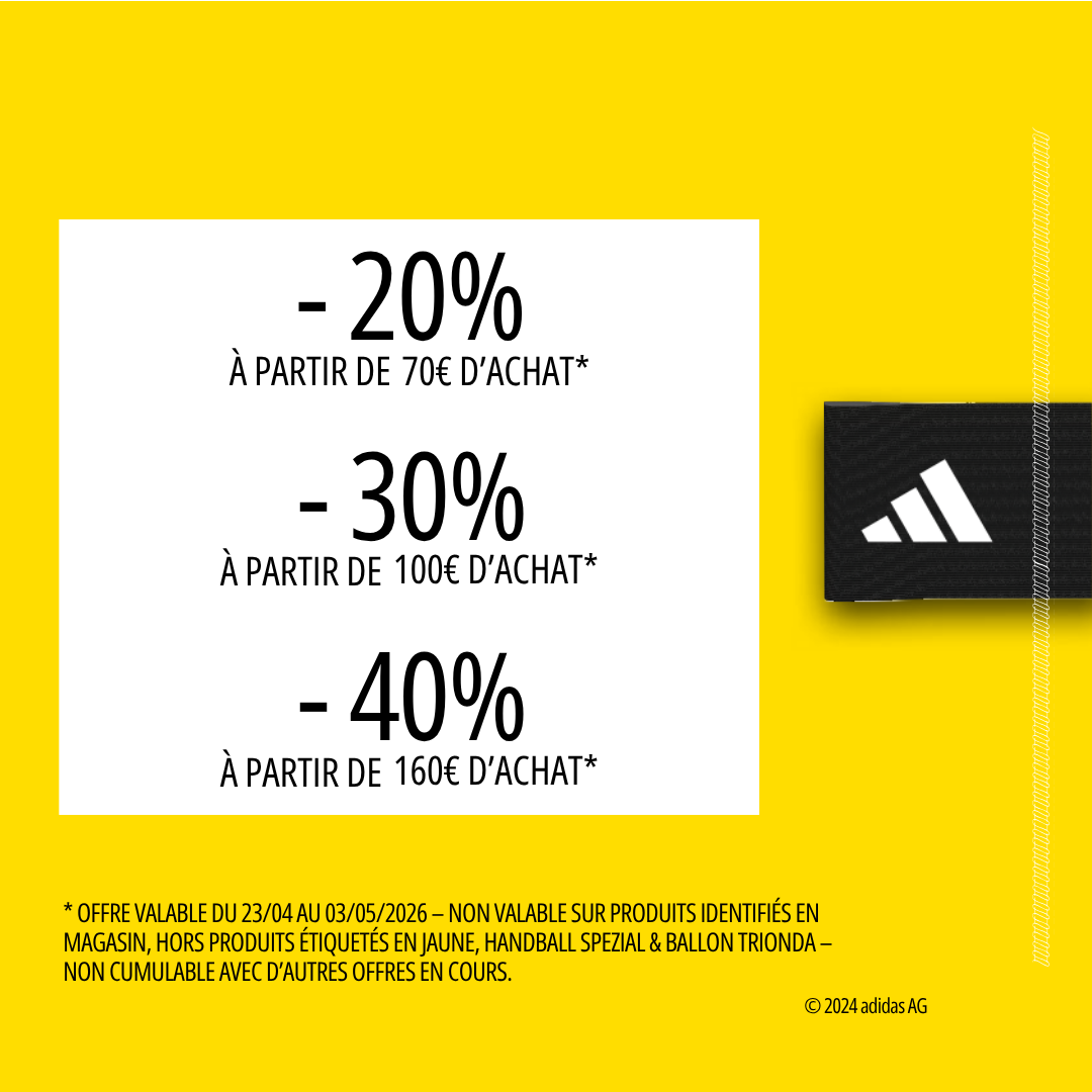 23 avril 2026 C’est les Crazy Days chez Adidas ! C’est le retour des CRAZY DAYS chez Adidas ! Jusqu’au dimanche 3 mai, profitez de : -20% Ă partir de 70€ d’achat -30% Ă partir de 100€ d’achat -40% Ă partir de 160€ d’achat Partagez ceci : Aller sur Facebook Contact