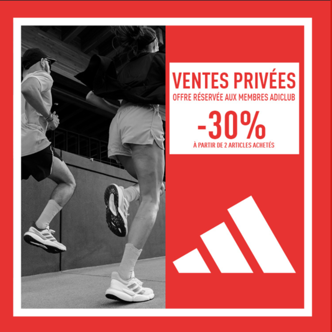 Adidas propose une offre exclusive aux membres adiclub : –30 % dès 2 articles achetés, valable jusqu’au 6 janvier sur une sélection d’articles identifiés en magasin.